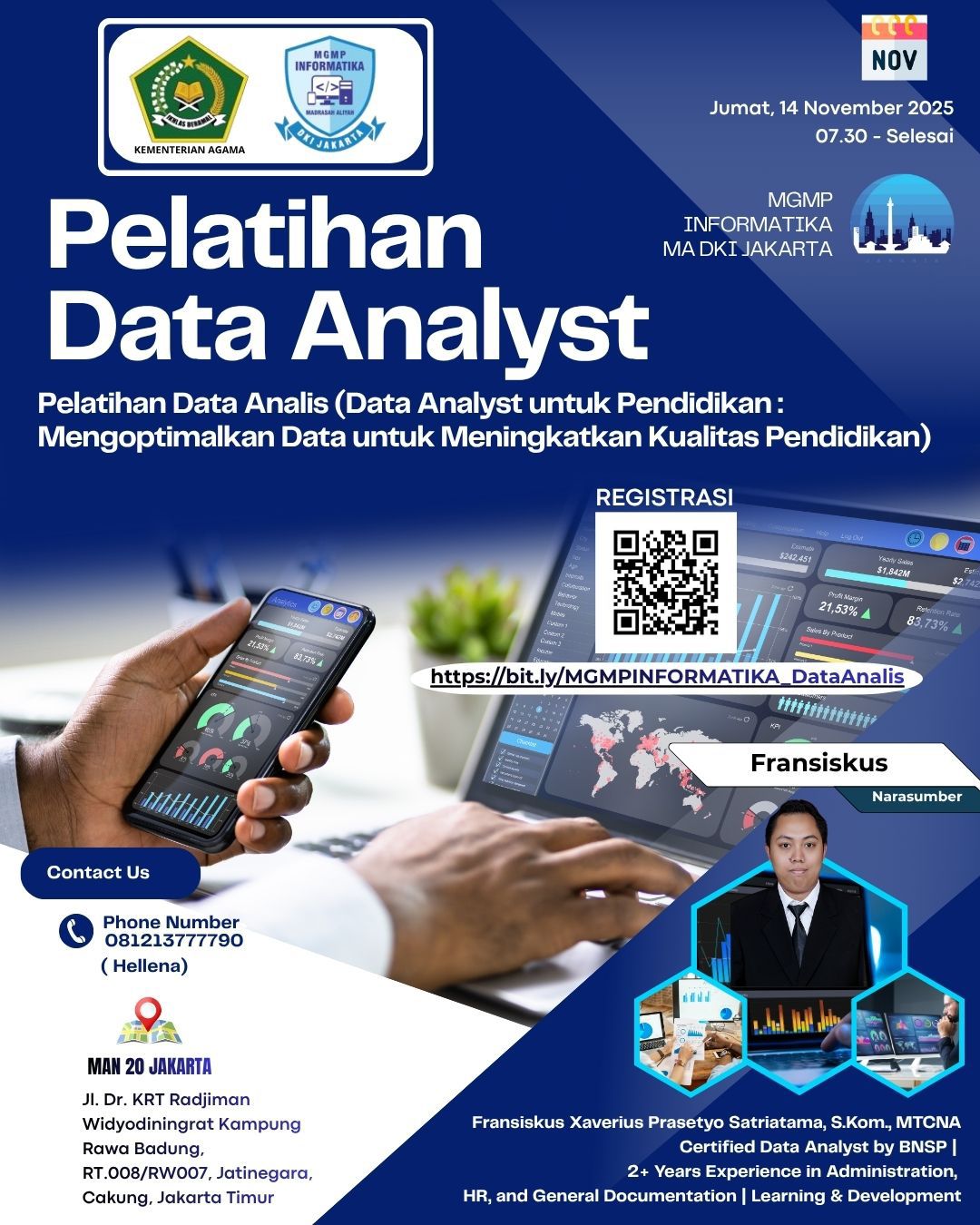 Yuk daftar kegiatan MGMP Informatika MA DKI Jakarta, ada 2 kegiatan pada waktu yang bersamaan, Pelatihan Data Analis (Data Analyst untuk Pendidikan: Mengoptimalkan Data untuk Meningkatkan Kualitas Pendidikan) dan Pelatihan / Workshop Create and Coding Line Follower Robot by Politeknik APP Jakarta