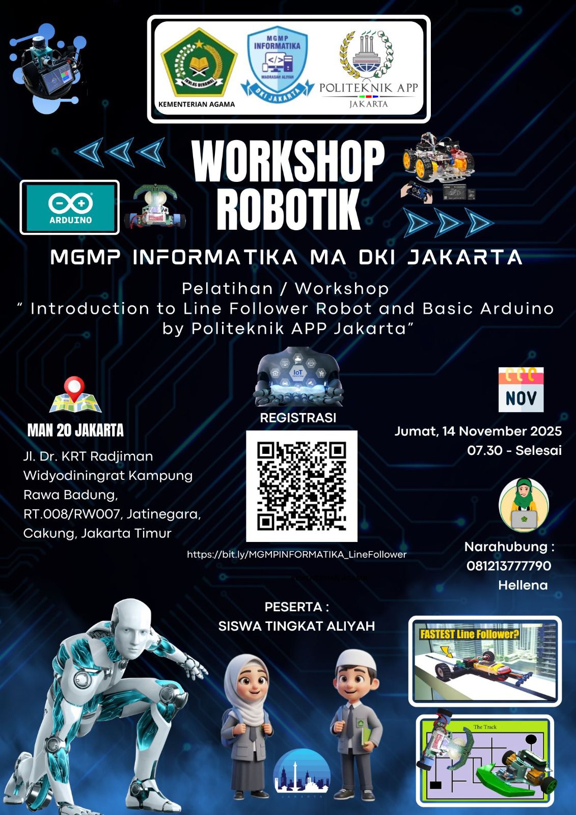 Yuk daftar kegiatan MGMP Informatika MA DKI Jakarta, ada 2 kegiatan pada waktu yang bersamaan, Pelatihan Data Analis (Data Analyst untuk Pendidikan: Mengoptimalkan Data untuk Meningkatkan Kualitas Pendidikan) dan Pelatihan / Workshop Create and Coding Line Follower Robot by Politeknik APP Jakarta